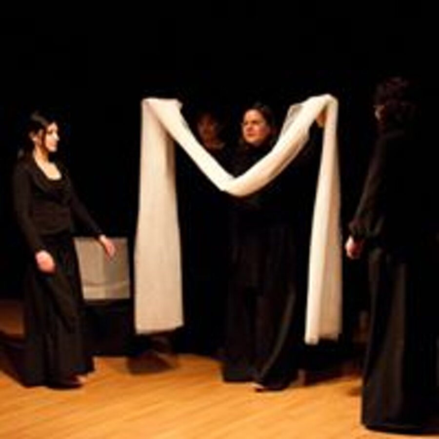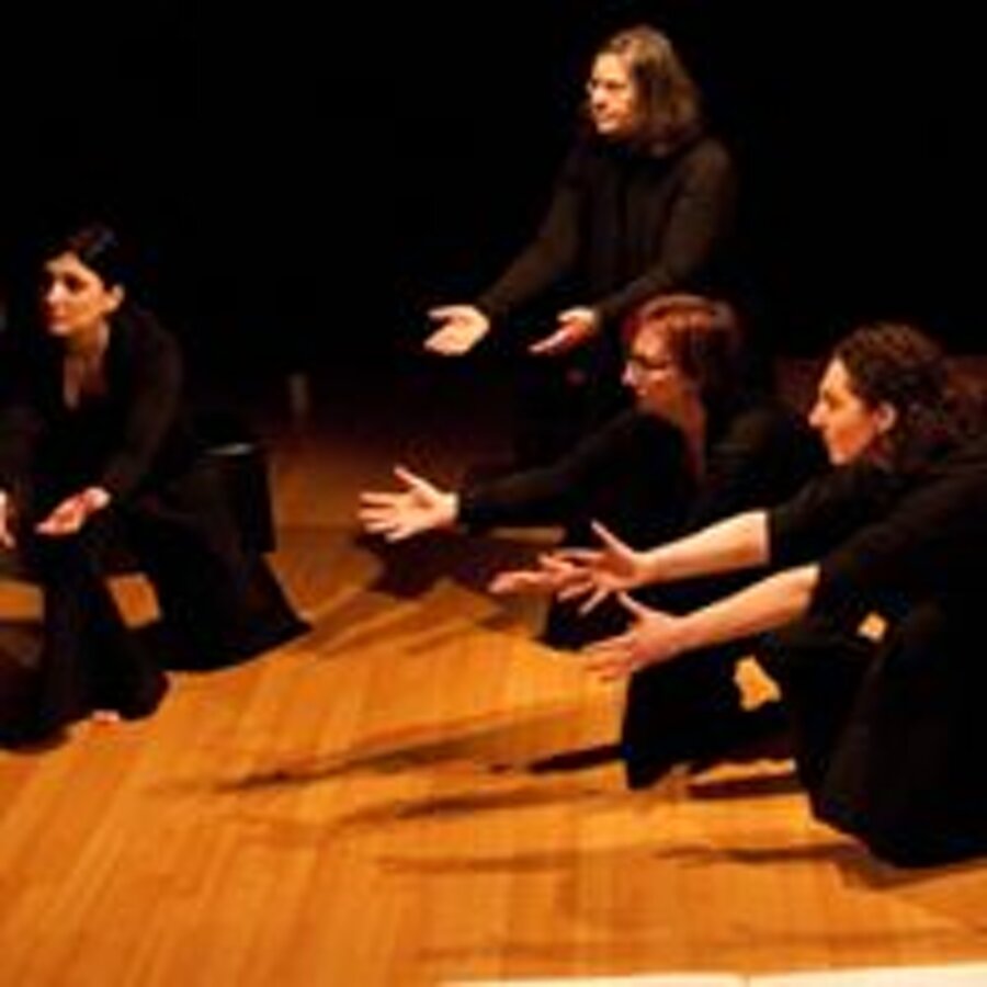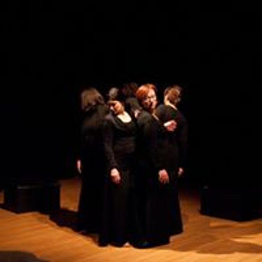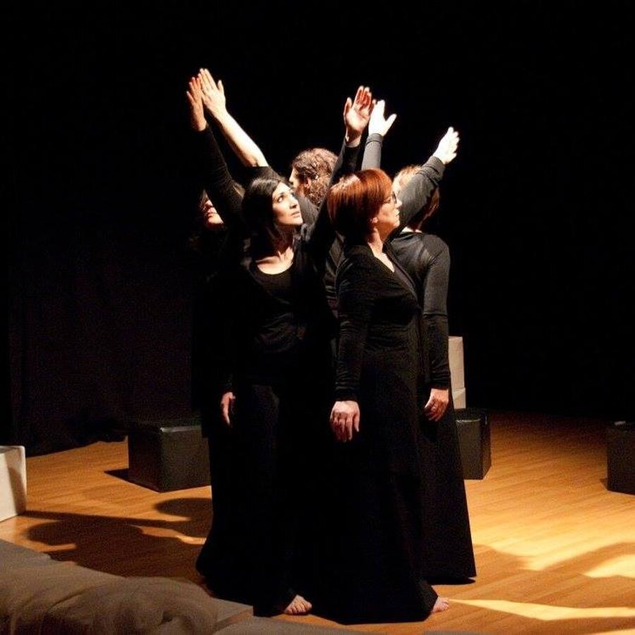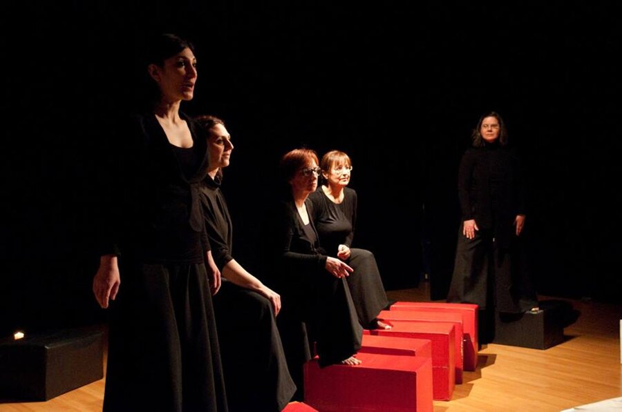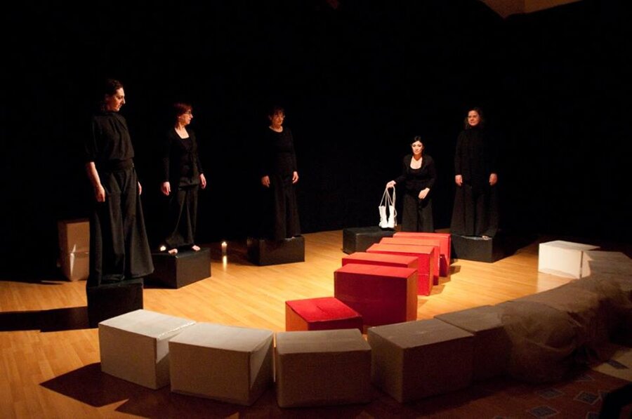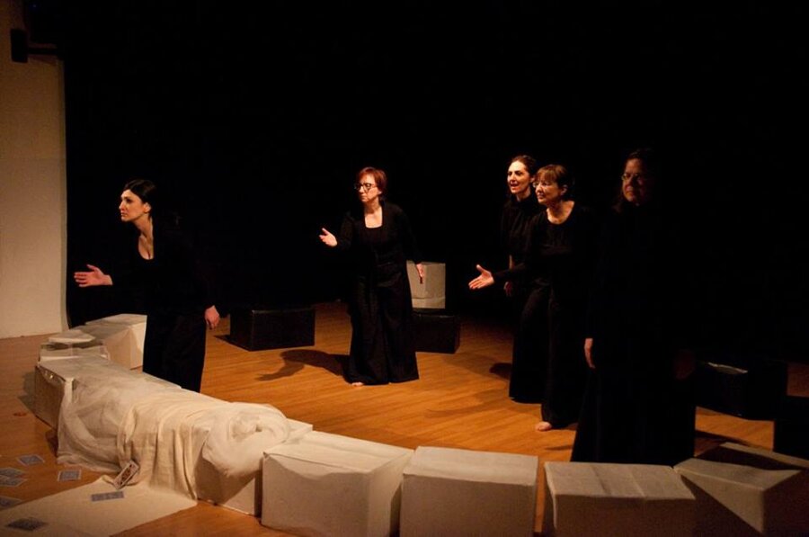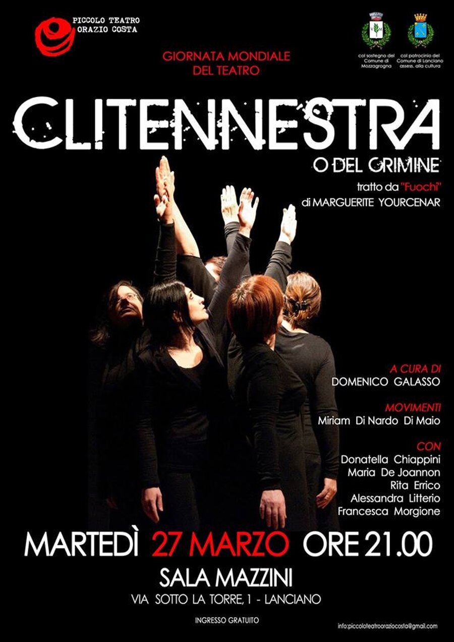 Clitennestra, regina di Micene, dal tempo del mito giunge fino a noi, e davanti ai nostri piedi nudi frantuma la sua marmorea, regale monumentalità e si umilia e si moltiplica in cinque voci femminili, frammenti concordi che compongono questo straziante grido d’amore, dipanando pensieri, ricordi, sentimenti del tutto umani.